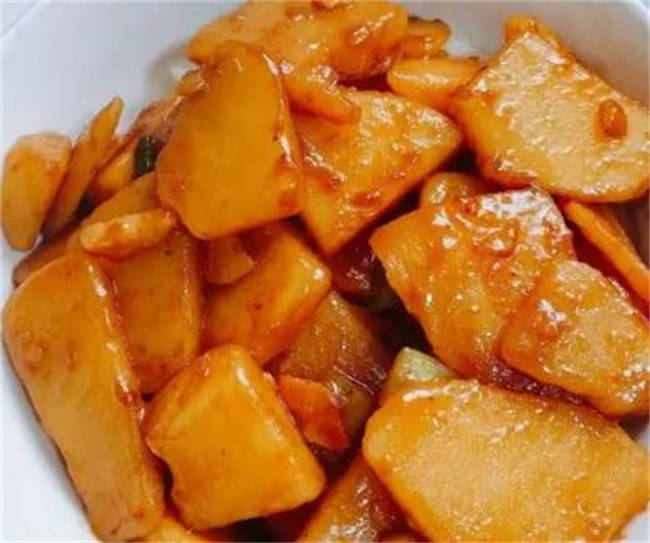 还有一种做法的红烧土豆片也是特别好吃的,需要把土豆改成稍微厚一点的片,然后锅里面多烧油,油热以后把土豆下进去炸熟捞出来以后再放上小米辣,蒜末,姜末,葱花,在锅里面调个味儿,放上点盐,十三香,鸡精,这样做出来的红烧土豆片也是特别好吃。