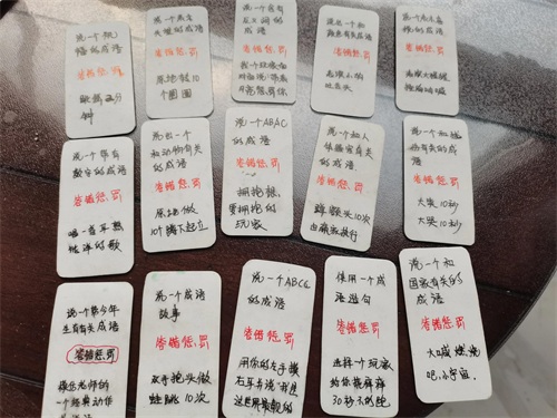 有输赢,就要有惩罚,设置一些有趣的惩罚,孩子会很喜欢玩的,我和我儿子玩成语接龙设计了很多有意思的小惩罚,很喜欢玩如下图,就是我成语接龙设计的小惩罚,大家可借鉴
