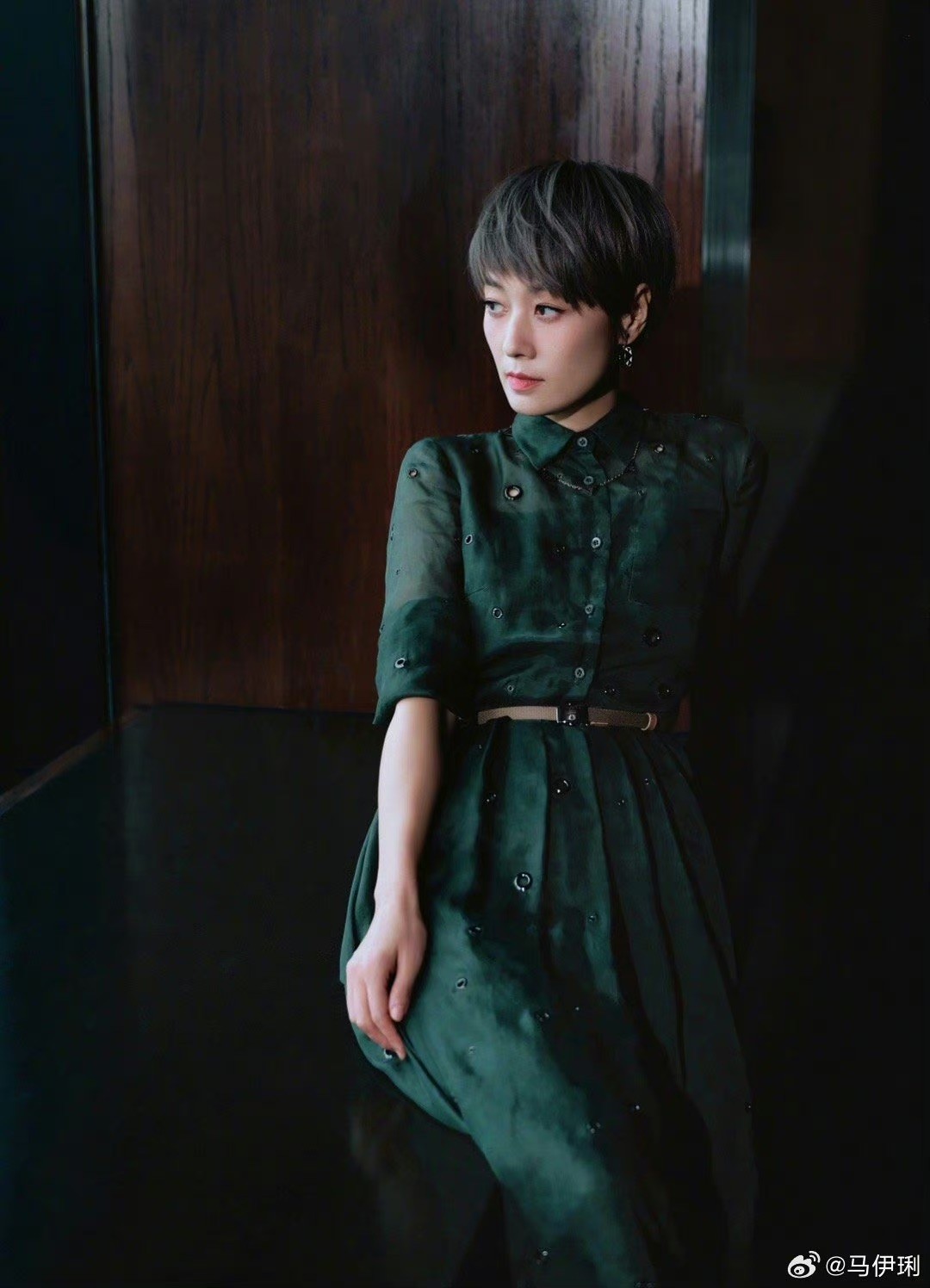 复古绿色连衣裙,挑染的短发,让马伊琍的颜值更出众。这种复古绿很高级、也很显白,显得马伊琍气质更出众。