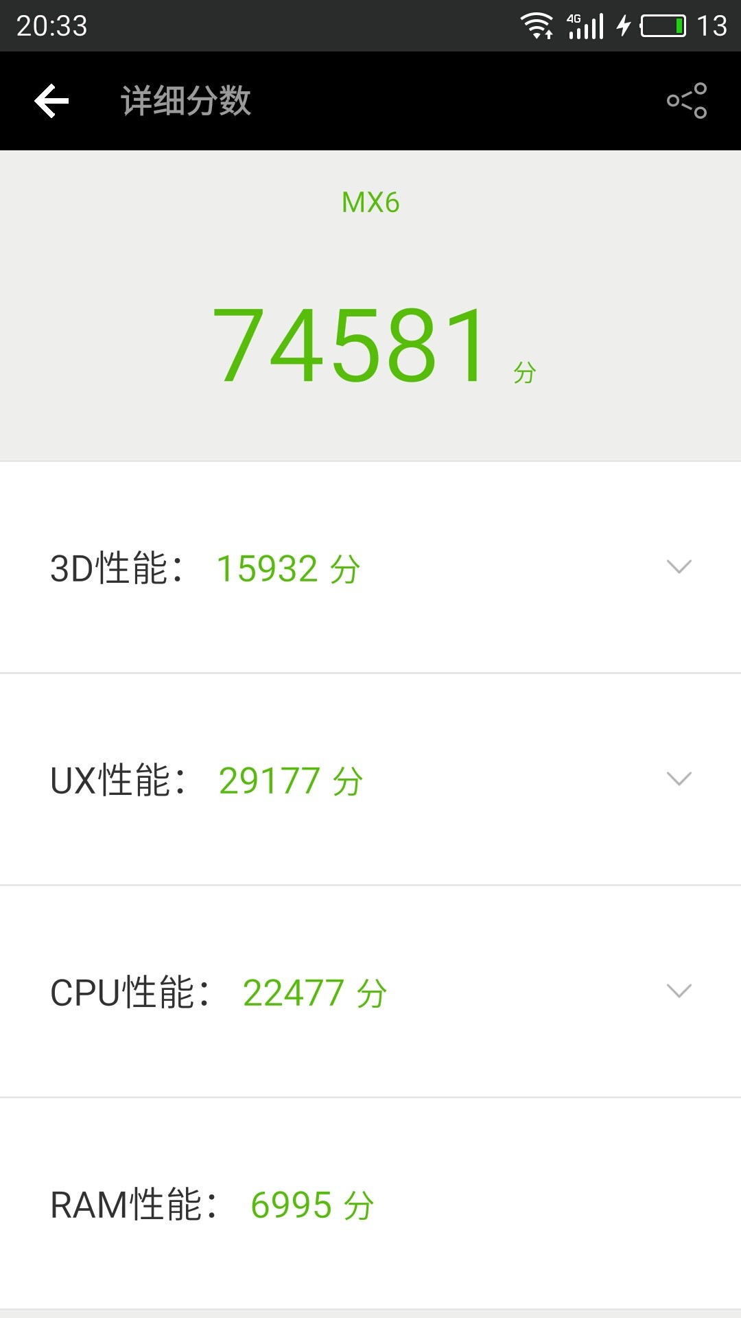 跑了下分安兔兔的MX6跑分成绩为92237,毕竟配备的是X20处理器,跑分也不会高出很多。魅族MX6系统是基于Android 6.0的Flyme 5系统,开启应用的时候也挺快,丝毫感觉不到有卡顿的时候。