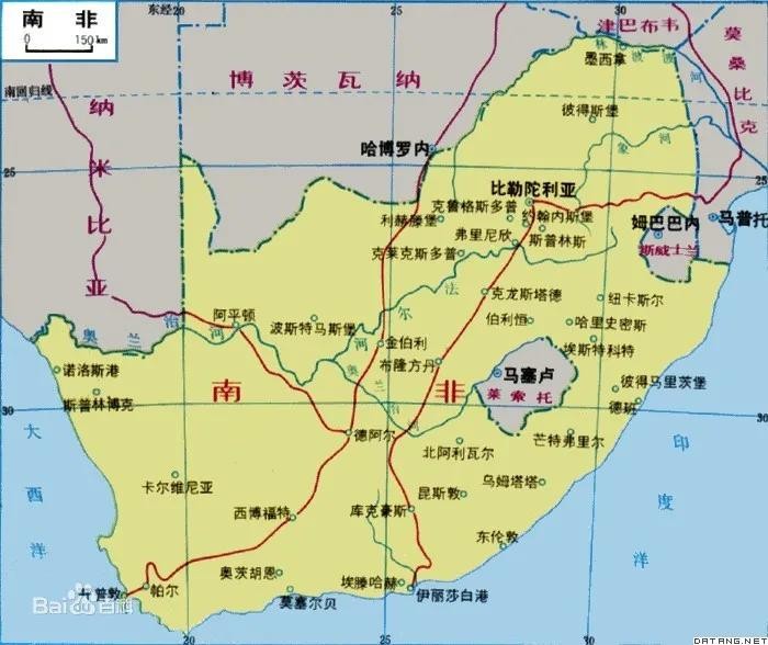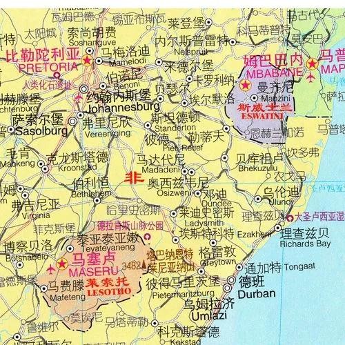南非共和国,简称“南非”。地处南半球,有“彩虹之国”之美誉,位于非洲大陆的最南端,陆地面积为1219090平方公里,其东、南、西三面被印度洋和大西洋环抱,北邻纳米比亚、博茨瓦纳、津巴布韦、莫桑比克和斯威士兰,中部环抱莱索托,使其成为最大的国中国。东面隔印度洋和澳大利亚相望,西面隔大西洋和巴西、阿根廷相望。海岸线长3000公里。南非最高点为东部大陡崖的塔巴纳山,海拔3482米。东部则是龙山山脉纵贯。其西南端的好望角航线,历来是世界上最繁忙的海上通道之一,有“西方海上生命线”之称。