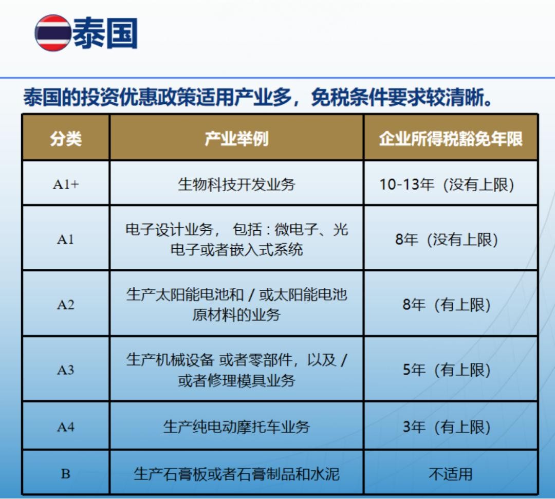 所以泰国的政策是有一个很长的清单,企业可以根据自己所处的产业,找到对应的产业级别,然后明确能享受几年的免税政策,很简单明了。