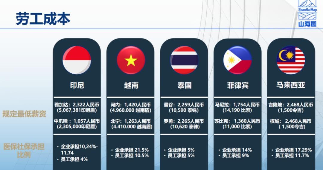通过对比可以发现,目前劳工成本最高的是马来西亚,所以马来西亚适合发展那种高技术产业,像医疗产业、IT产业就可以考虑落地在马来西亚。