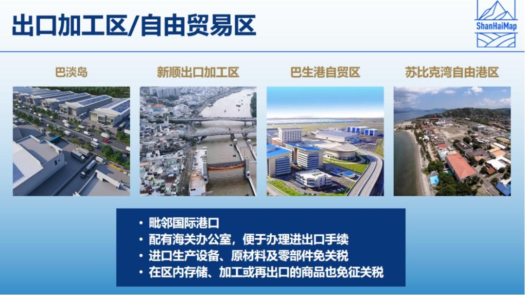 越南有新顺出口加工区,这是越南比较重要的一个区域,虽然它叫出口加工区,和我们通常说的自贸区名字不太一样,但功能类似。马来西亚有巴生港,那里是一个自贸区。菲律宾的苏比克湾是自由贸易区,它以前是军事港口,现在正在转型为自由贸易区。