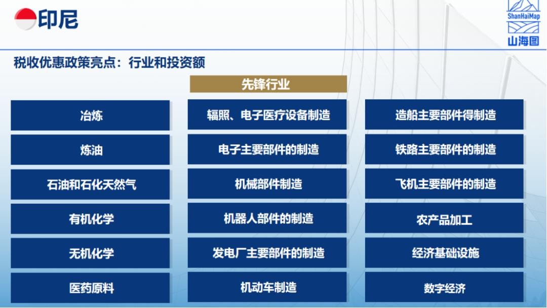 所以你可以看到,最低投资额是4500万人民币,这样至少能给你5年减免一半企业所得税。如果投资上百亿,甚至100多亿,印尼可以直接给你免20年企业所得税。这是我目前看到的东南亚国家里免税力度最大的政策。