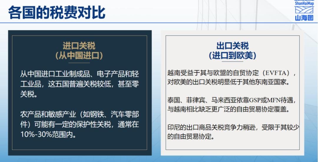 很明显,菲律宾的企业所得税或者增值税在这些国家里是最高的,企业所得税达到25%,增值税为12%。而有税收优惠的是越南和泰国,它们的企业所得税是20%。印尼之前是24%,后来好像在疫情期间降到了22%。