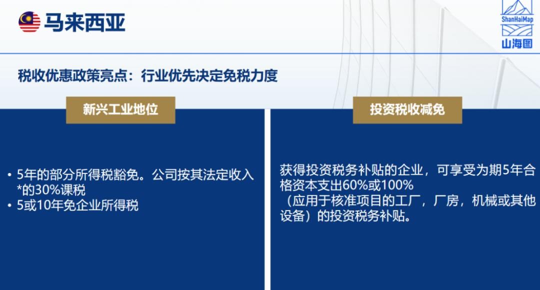 简而言之,免税政策主要有两类:一是给予“新兴工业地位”,即直接免税;二是投资税收减免,也就是用企业的支出抵扣税款。一般情况下,企业最少能够获得 5 年按收入的 30%交税的待遇,如果符合特定产业要求,还可能享受 5 至 10 年的免税期。虽然其免税力度相比越南、泰国、印尼可能稍小,但仍然存在机会。所以,企业若要在马来西亚投资,需要精准对应产业,深入了解政策,并积极与政府沟通争取,尽可能多地申请到优惠政策。