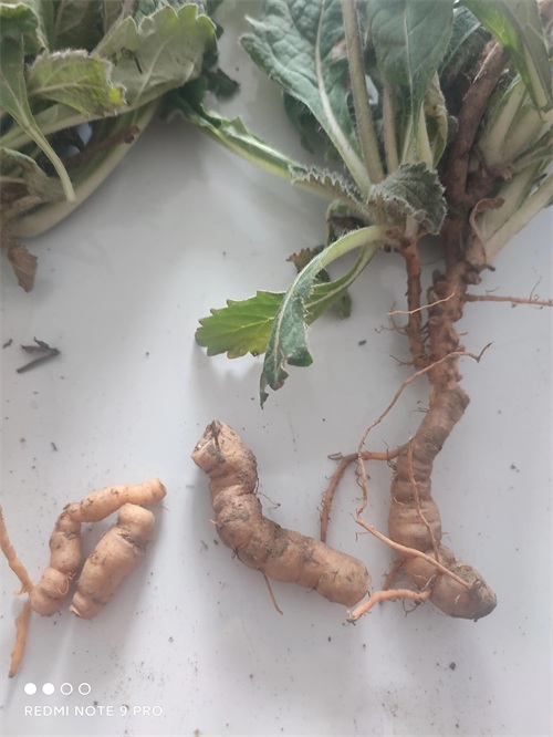 结的果实如小麦粒,粒可以做种子,也可以入药。它的根茎赤黄色,小时候用它的根汁来染画,但它的根是很好的药材,分生地黄和熟地黄。根茎图片如下图: