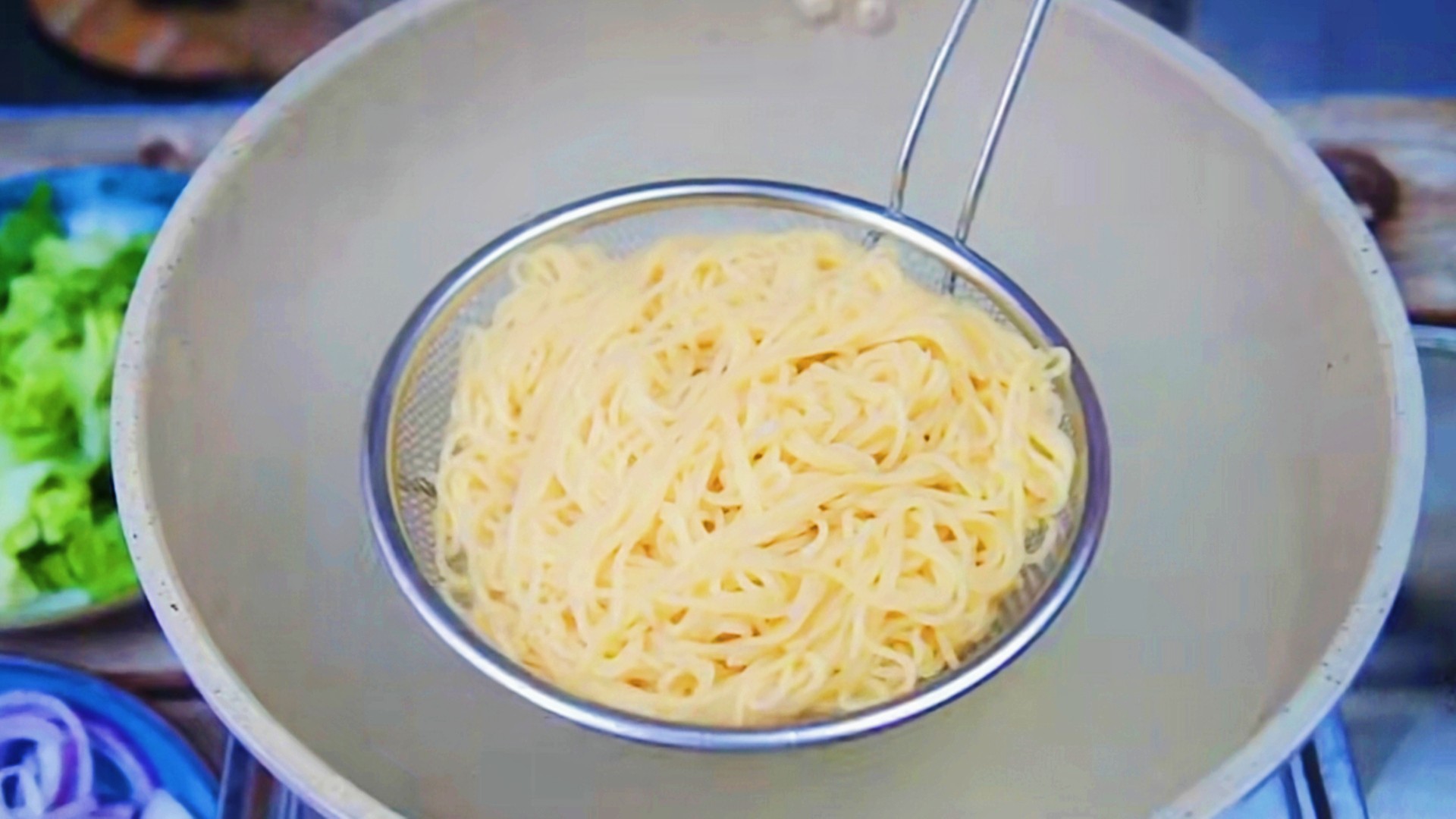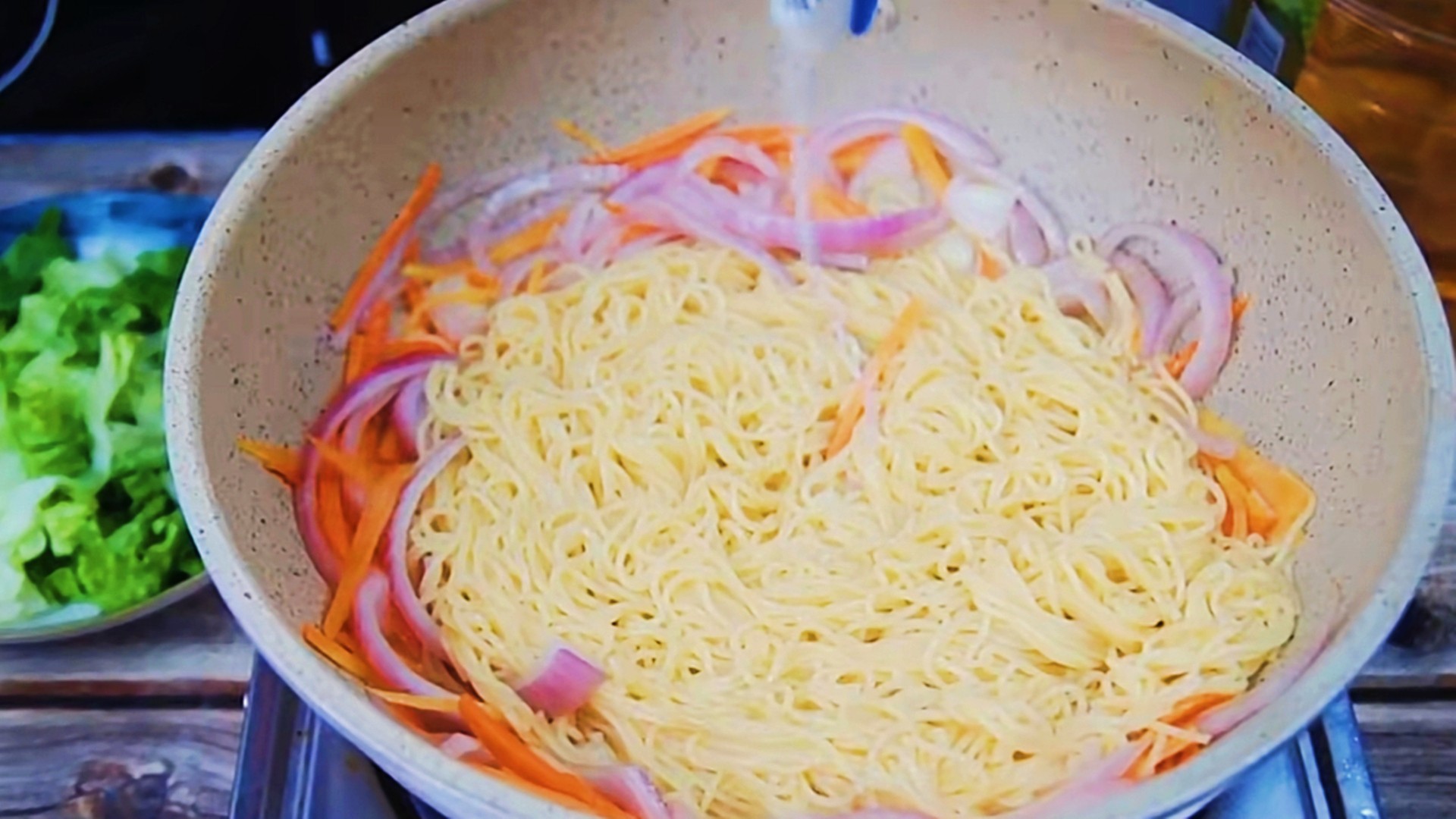 【食材准备】:面条 生菜 鸡蛋 洋葱 胡萝卜 食用油 食用盐 老抽 蚝油