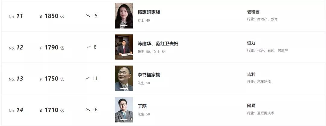 除了互联网企业之外,每年富豪榜总少不了地产大亨们的身影。不过今年,房地产富豪们的身价“缩水”的厉害,没有一个进前十,最高的是来自碧桂园的杨惠妍,位居第11名,财富值为1850亿元,比去年下降了5个位次。
