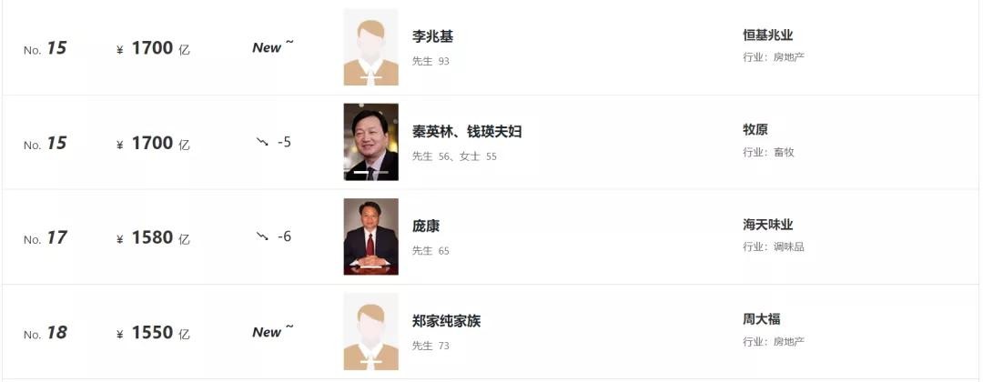 而世茂集团的许荣茂下降了17、万达的王健林下降了11、龙湖的吴亚军下降了16……而最为夸张的就是恒大集团的许家印,直接从去年的第5,下降到了今年的第70名,财富呈过山车式的缩水了。曾几何时,许家印也当过首富,地产过热的年代已经一去不复返了。