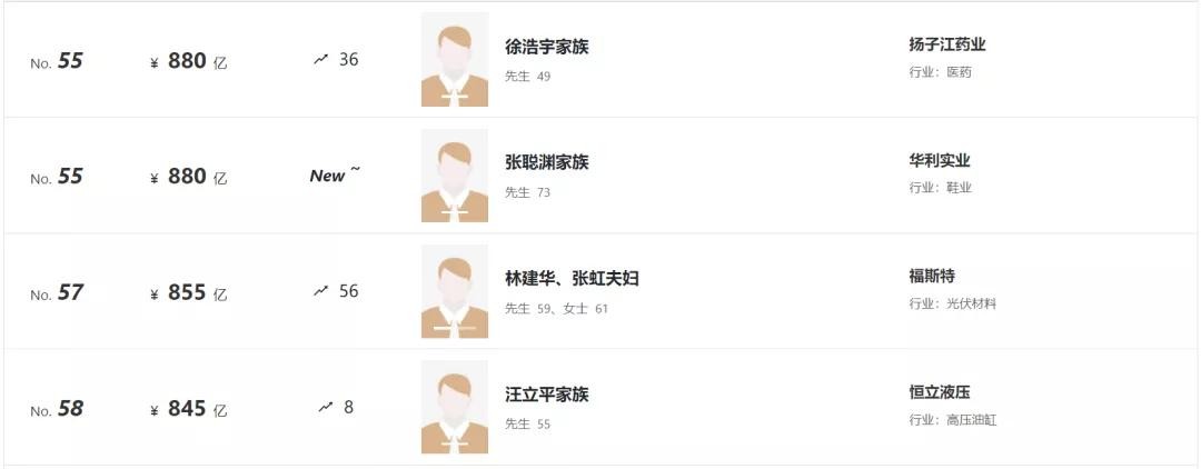 而排名升得最快的,要数今年的第七名——魏建军、韩雪娟夫妇,作为长城汽车的创始人,去年还只排在第89位,今年就凭借2180亿元的财富一跃升到了前十名。