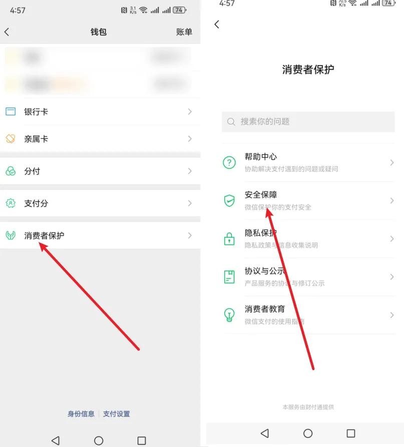 2、进入钱包后我们再点击【消费者保护】,然后再找到并点击【安全保障】,如下图所示: