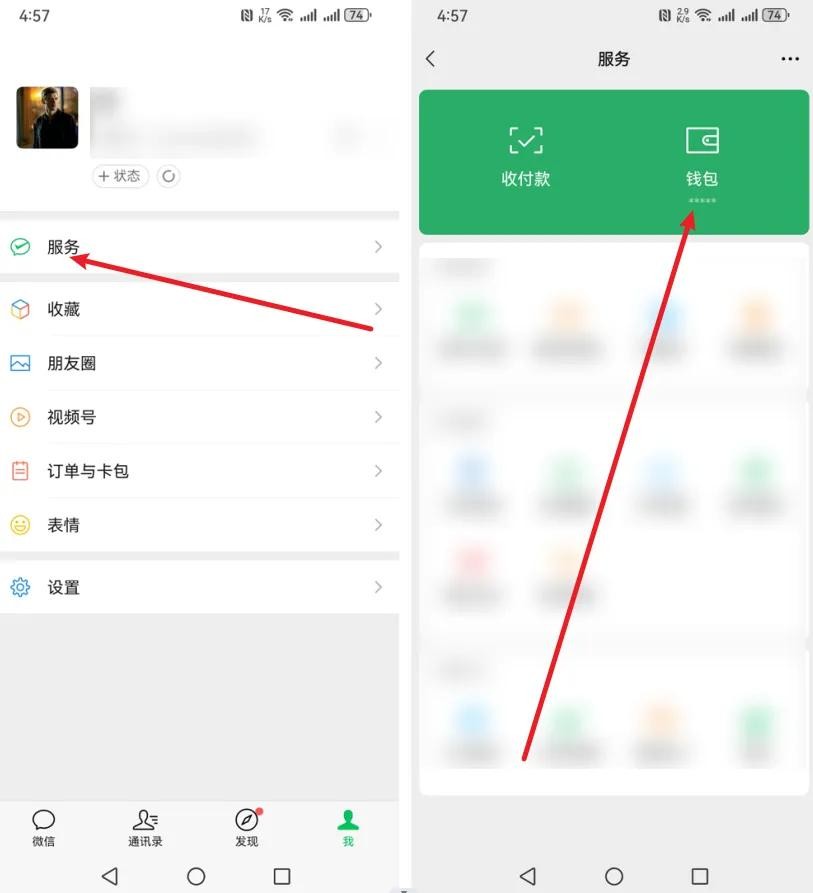 1、打开我们的微信,然后在底部的【我】中点击【服务】,接着点击【钱包】;