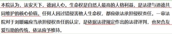 对江秋莲与刘暖曦生命权纠纷一案,山东省青岛市城阳区人民法院的一审判决书、山东省青岛市中级人民法院的二审判决书,除了依法有理有据外,是极富正义感的判决。“法安天下,德润人心”的理念应更加深入人心。