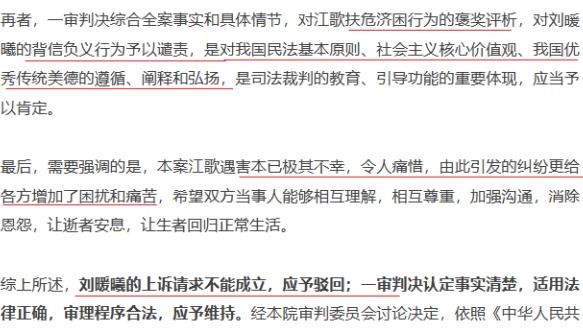 “需要指出的是,江歌作为一名在异国求学的女学生,对于身陷困境的同胞施以援手,给予了真诚的关心和帮助,并因此受到不法侵害而失去生命,其无私帮助他人的行为,体现了中华民族传统美德,与社会主义核心价值观和公序良俗相契合,应予褒扬,其受到不法侵害,理应得到法律救济。刘暖曦作为江歌的好友和被救助者,在事发之后,非但没有心怀感恩并对逝者亲属给予体恤和安慰,反而以不当言语相激,进一步加重了他人的伤痛,其行为有违常理人情,应予谴责,应当承担民事赔偿责任并负担全部案件受理费。”