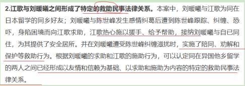 (2)一审法院认为刘暖曦与江歌双方形成一定的救助关系,“作为危险引入者和被救助者,刘暖曦对江歌负有必要的注意义务及安全保障义务”。