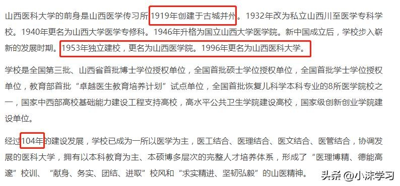 山西医科大学的前身是1919年创建于并州的山西医学传习所。1946年升格为国立山西大学医学院,1996年更名为山西医科大学。