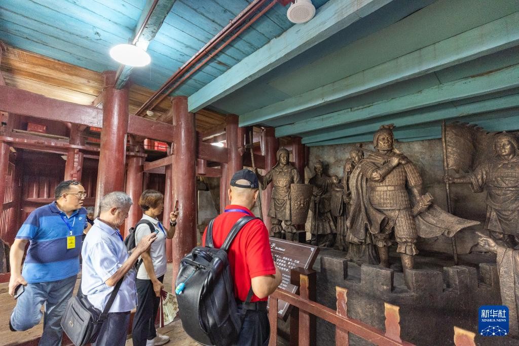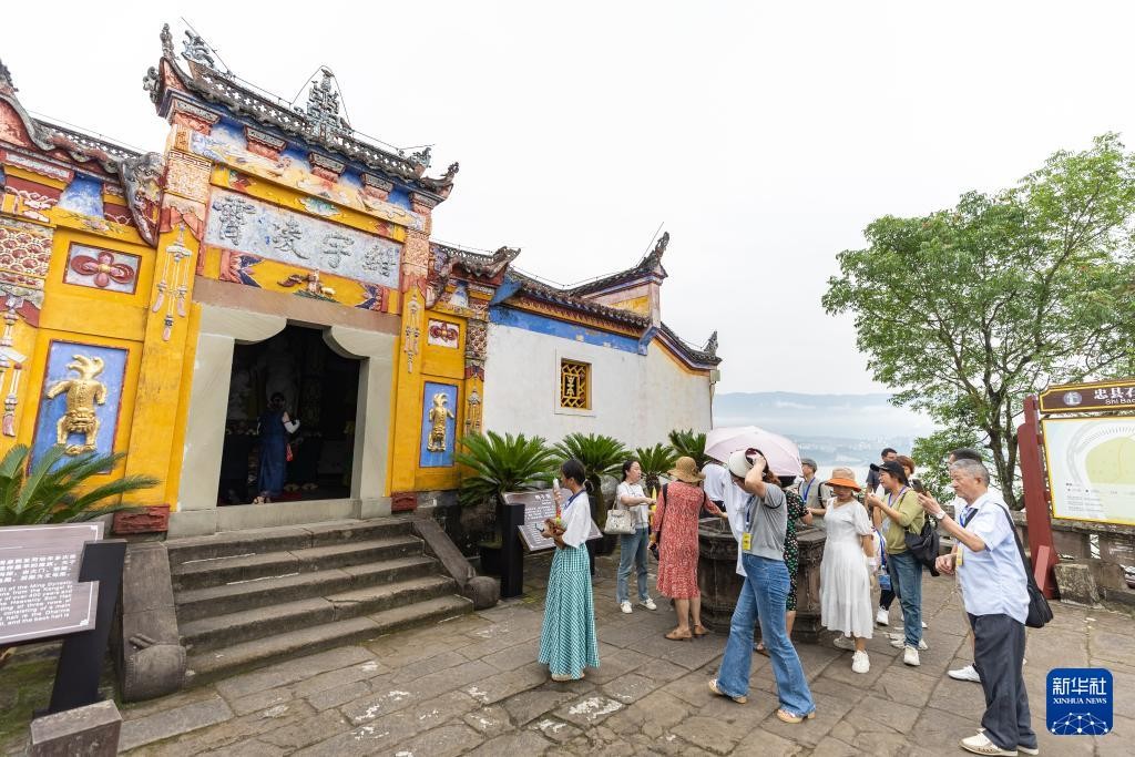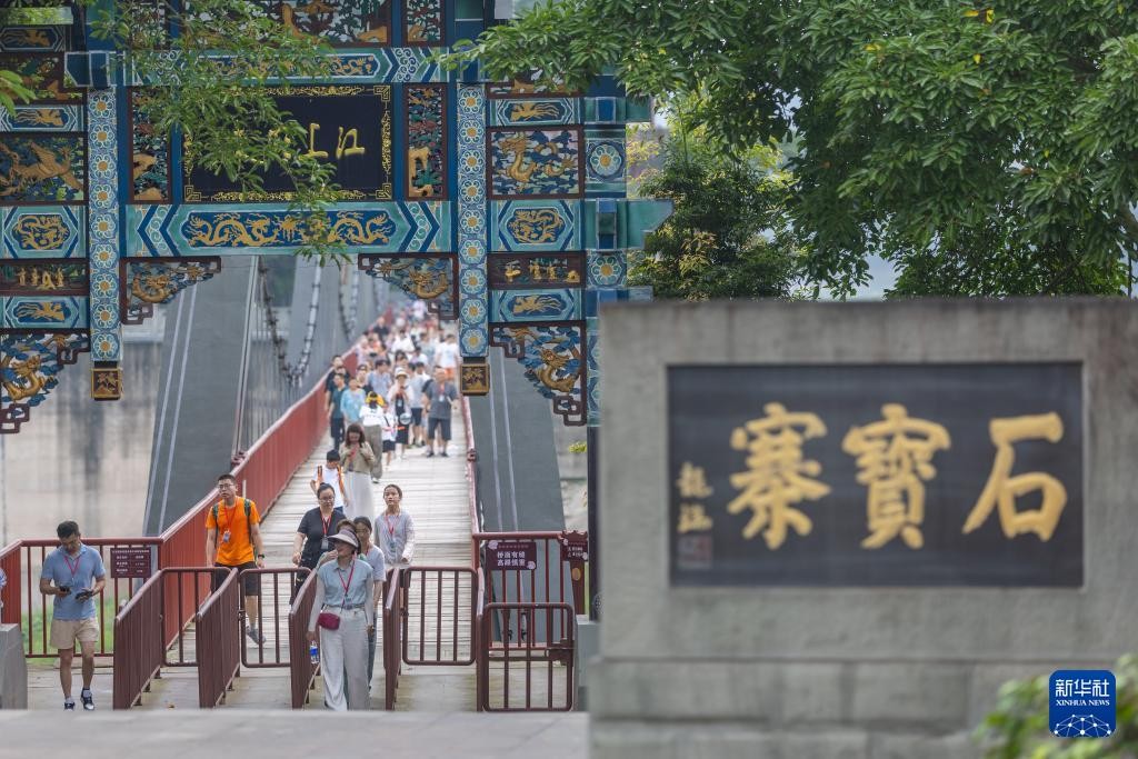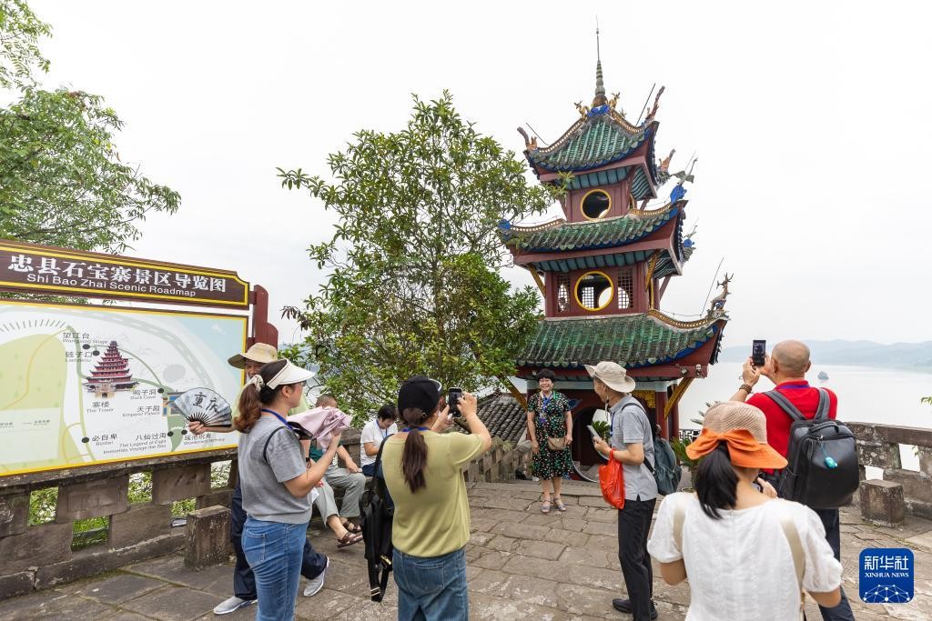 7月10日,游客在位于重庆市忠县的石宝寨参观游览。