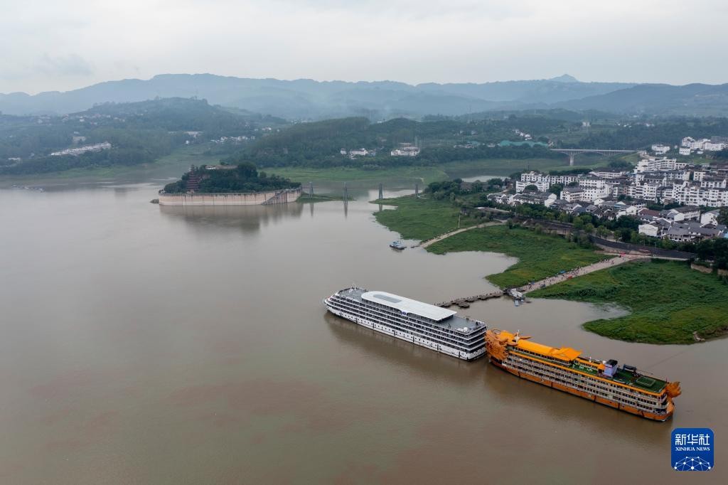 7月10日,两艘游轮靠港在石宝寨码头,方便游客前往石宝寨参观游览(无人机照片)。