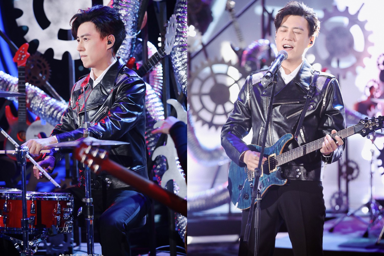 除了朱一龙的惊艳表现之外,靳东的表现力也超高。这还是我们认识的那个《精英律师》里的罗槟吗?霸道总裁玩摇滚,厉害了!瞧,身穿机车皮衣的靳东,敲着架子鼓,举手投足尽显帅气摇滚范。此时他不仅是一位鼓手,还是一位吉他手,唱歌《从头再来》的歌曲,烟酒嗓太好听了,让观众感受到满满的快乐。