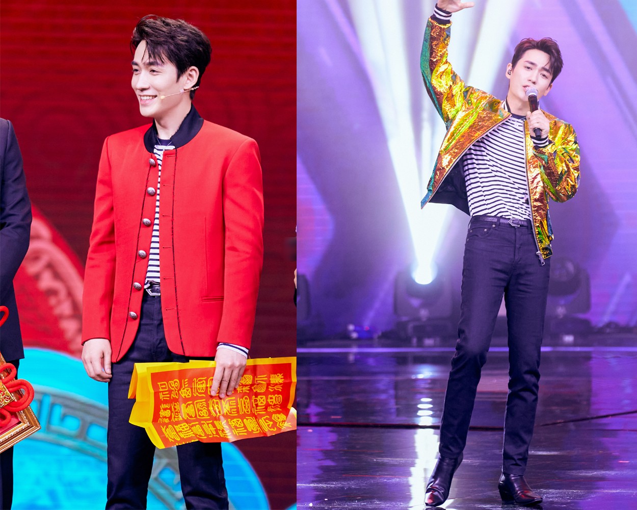 唱两首歌曲的朱一龙,舞台造型也从活力四射到喜气洋洋。金色夹克,内搭条纹T恤,显得随意又动感,下半身穿小脚休闲裤,瘦瘦的身材又散发青春的活力,唱歌时手臂摇摆,简直是帅翻天的节奏啊。换上了红色金属纽扣镶嵌小西装的朱一龙,太喜庆了吧。当他笑起来的时候,侧脸望去,真叫一个迷人,妥妥的“美貌杀人”。