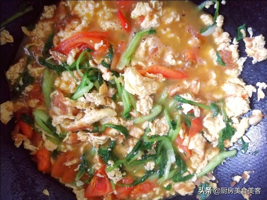 3.起锅烧油,油8成热,放入鸡蛋液炒熟炒散后盛出,锅内少许油,油热放入葱蒜炒香,放入西红柿快速翻炒炒出红油,放入鸡蛋,清水,小青菜,盐,生抽,胡椒粉,白糖,煮开煮熟盛出。