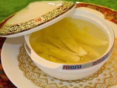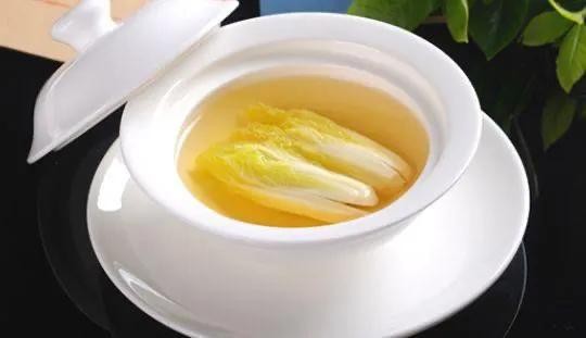 3.把吊好的清汤分成两份,一份用来烫白菜心,等白菜心烫熟后,放入瓷器中,盛入另一份吊好的清汤即可。