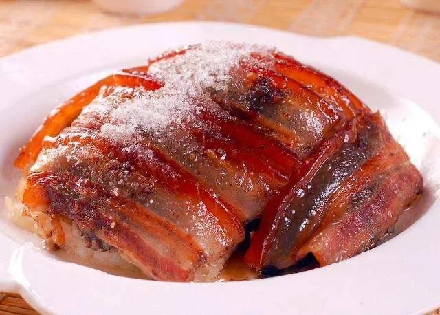 2.把糯米煮熟,用白糖、红糖、猪油搅拌均匀备用,虎皮肉切薄片,两个一组,中间加入豆沙,整齐地码放在碗底,上面放上糯米,压实;