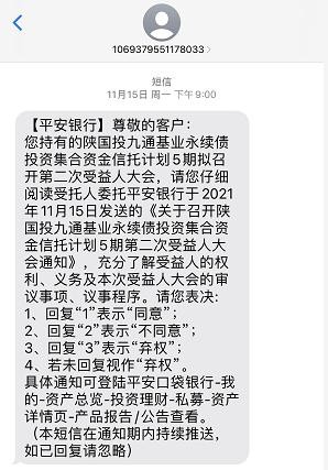 王希表示,因为平时工作较忙,且出于对平安银行的信任,起初并没有注意到陕国投·九通基业的分红逾期情况。直到2021年11月15日,她收到了平安银行发来的“关于召开陕国投·九通基业永续债投资集合资金信托计划5期第二次受益人大会通知”的短信,在询问客户经理杜女士后,她才得知,产品兑付出现了困难,最近几个季度的利息也没有到账,自己这是“踩雷”了。