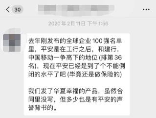 据王希回忆,客户经理杜女士在一开始介绍陕国投·九通基业这一产品时就告诉她,九通基业是华夏幸福的全资子公司。据王希提供的聊天记录截图显示,杜女士称,平安集团与华夏幸福签订了一个战略合作协议,平安现在是华夏幸福的第二大股东,最近也发了不少华夏幸福的产品。平安作为华夏幸福的融资方,有险资,有全金融综合牌照,可以给华夏幸福提供源源不断的资金流。