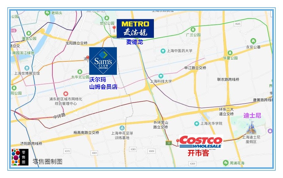 新兵COSTCO(开市客)在2019年在上海开出一家店之后,可谓一举成名,再店铺还没开业之前就已经卖足了会员费。开店当天更是因为人流过大而导致停止营业,第二天之后开始限流,也是场场爆满。如今,开市客迅速布置二店,可见其模式的成功和可复制性基本得到检验。沃尔玛山姆在上海总计有两家门店,其中第二家门店距离开市客闵行店13公里左右,历史的车轮总是惊人的相似,本次开市客即将要开业的二店浦东店距离沃尔玛山姆会员店也是13公里左右,开车20分钟左右,距离上海迪士尼更是一个地铁站的距离。麦德龙在上海已经有了年份,目前在上海有近10家门店,其中上海浦东店与山姆会员店近在咫尺。目前这三家店可谓短兵相见。