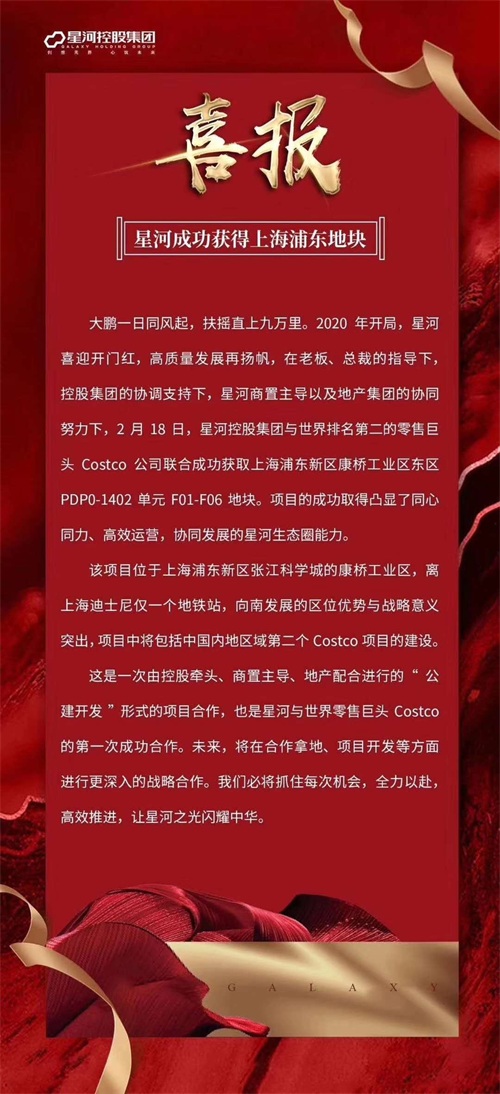 上海土地市场官方网站显示,2月18日,星河控股集团旗下子公司——上海河裕实业有限公司与世界零售巨头Costco公司旗下独资公司Pudong Warehouse Development Limited以8.98亿元联合获取上海浦东新区康桥工业区东区PDP0-1402单元F01-F06地块。
