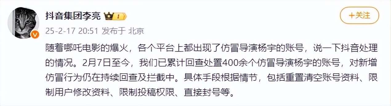 对此,2月17日,抖音集团副总裁李亮在社交平台发文回应该事件。李亮表示:“随着哪吒电影的爆火,各个平台上都出现了仿冒导演杨宇(饺子)的账号,说一下抖音处理的情况。”