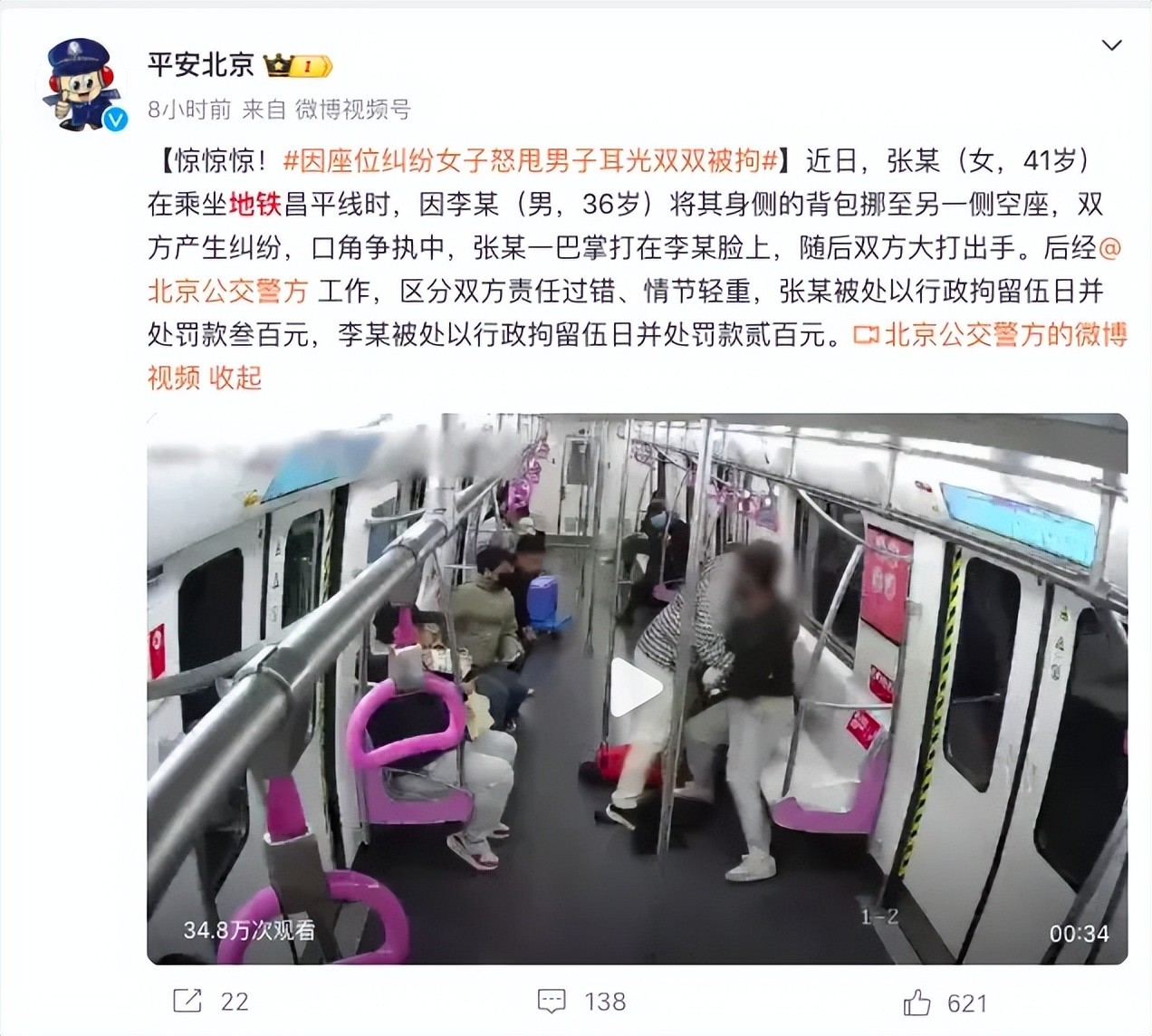2月17日,据@平安北京 披露,近日,张某(女,41岁)在乘坐地铁昌平线时,因李某(男,36岁)将其身侧的背包挪至另一侧空座,双方产生纠纷。