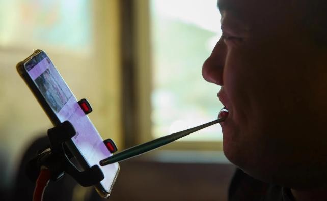 没有双手的袁立东开始用嘴巴里的筷子进行游戏操作。