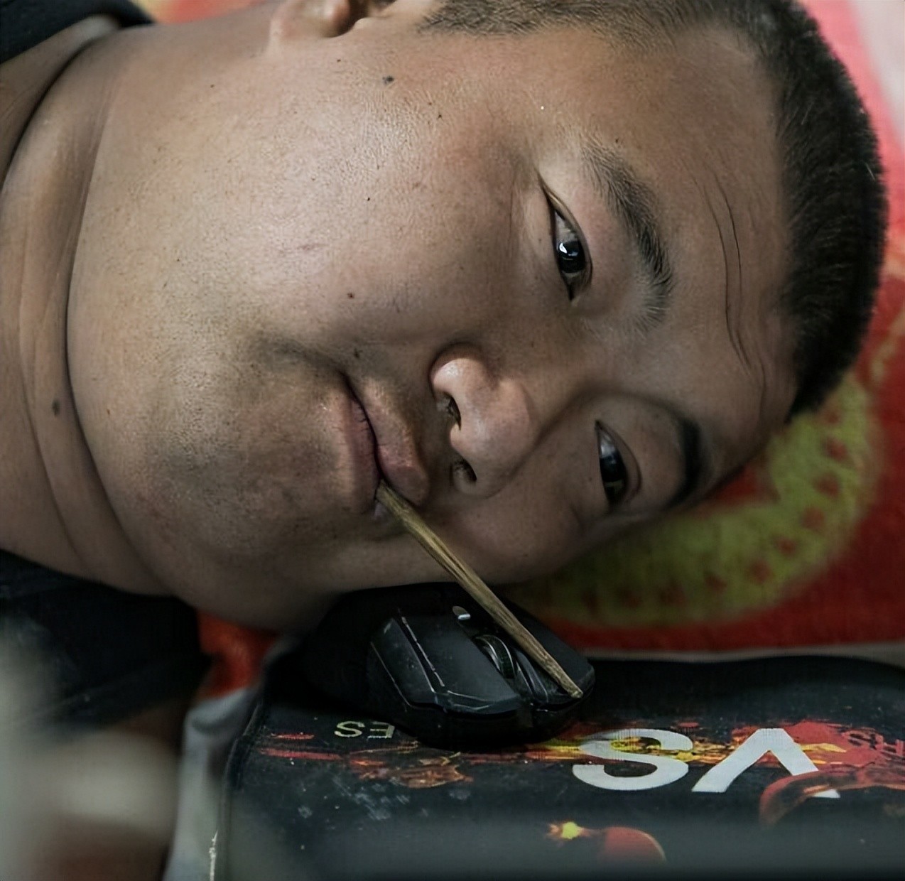 袁立东侧躺在床上,靠嘴巴叼着一根筷子,熟练地在键盘上敲击,依靠脸颊肌肉控制鼠标,专心进行游戏操作。