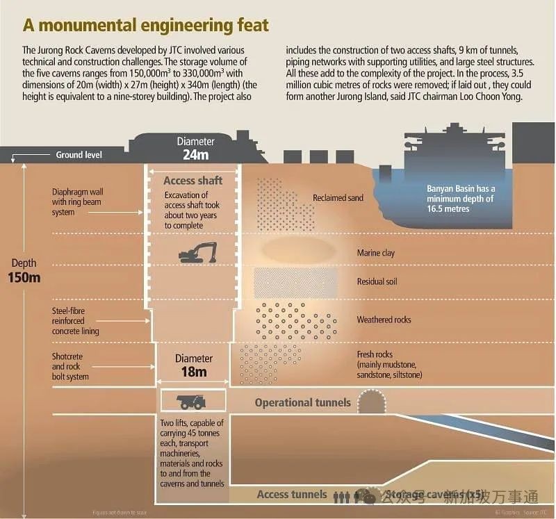 此外,新加坡还在40楼层深(约合150米深)的地下建造了一个巨大的石油储存库:裕廊岩洞(Jurong Rock Caverns)。