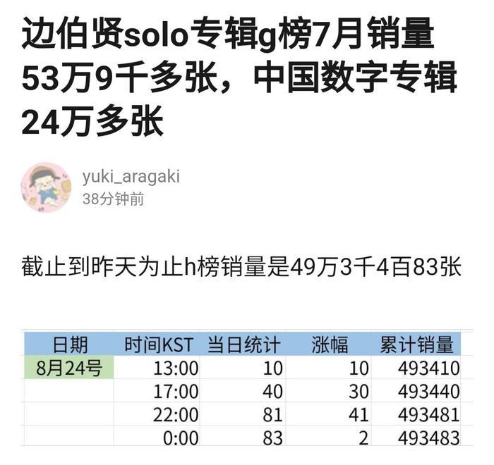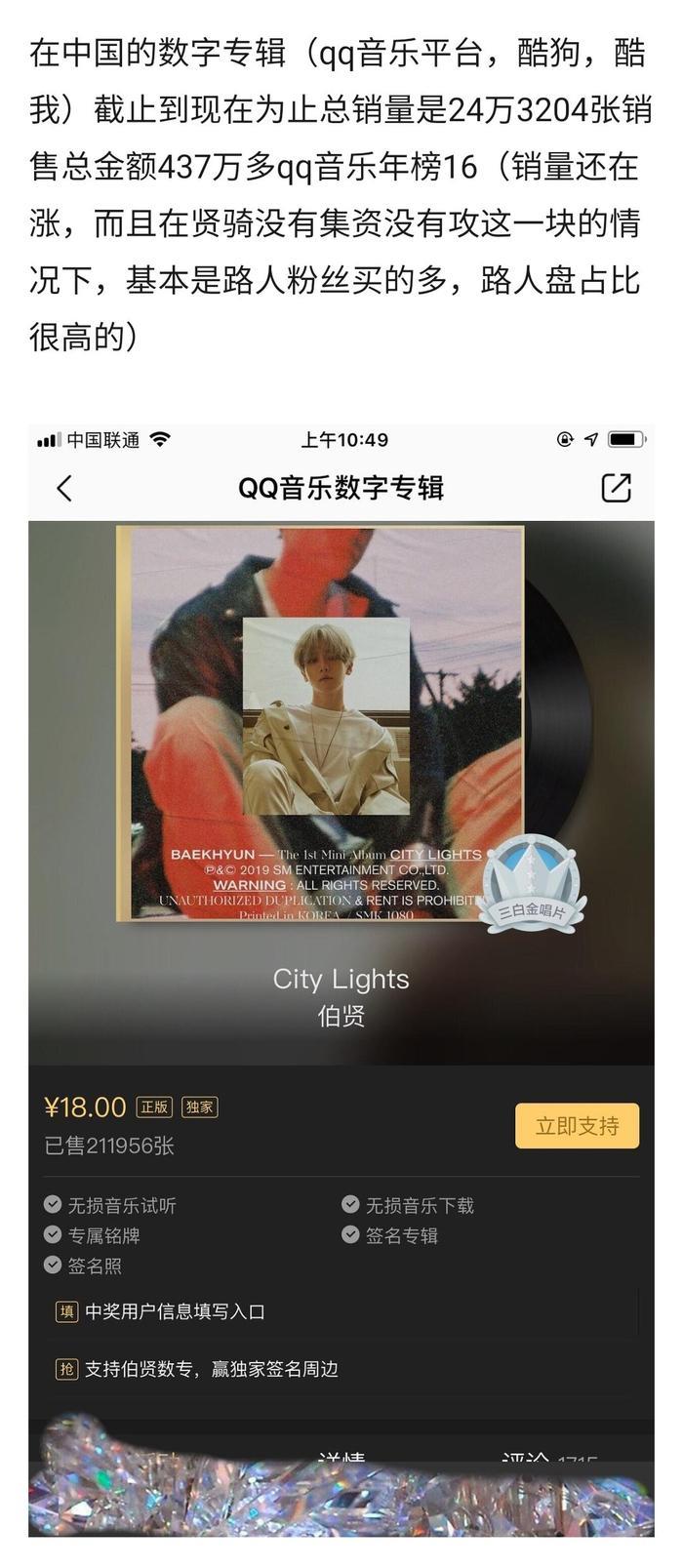 边伯贤solo专辑成绩汇总~边伯贤首张个人solo专辑《City Lights》G榜七月销量53万+,占据多个专辑榜单一位,QQ音乐数字专辑在没有粉丝主攻的情况下销量27万+,总销售额437万+。首张solo专辑便取得如此优异的成绩,天才爱豆边伯贤人气与实力的认证@baekhyunee7