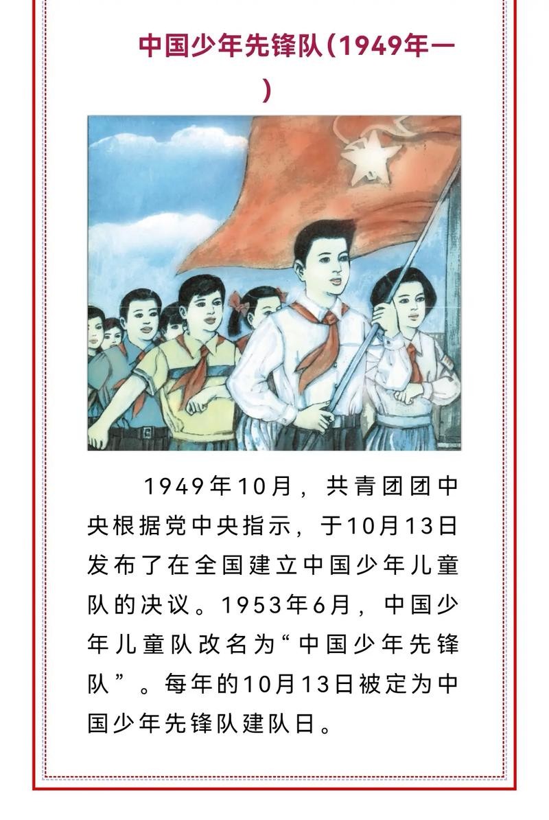 1949年10月13日,随着中国新民主主义青年团第一次全国代表大会的决议,团中央正式公布了《关于建立中国少年儿童队的决议》和《中国少年儿童队队章草案》。