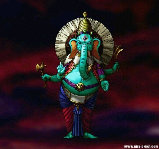 印度神话中的象头神,智慧与繁荣之神。湿婆与帕尔瓦蒂的儿子。特征是大腹便便的肚子和一支象牙。围绕他的象头有不少版本的传说,总之共同的一点都是他本来是正常的人形,因为事故失去了自己的头而使用象头代替。关于失去的一边象牙也有多种说法。 与看起来蠢笨的外表相反,伽内什非常聪明,他的大头里装满了知识,被尊为学术之神。印度教经典《吠陀》即为他所著。体现他的智慧的一个有名的典故是他和自己兄弟,战神卡尔凯蒂耶比赛,看谁先走遍世界。在卡尔凯蒂耶环绕世界一周,精疲力尽地返回时,伽内什早已结束了他的旅行----他通过博览关于世界知识的书籍,而不是亲自步行,赢得了这次比赛。