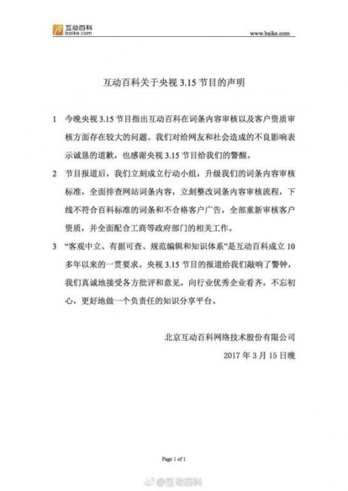 法制晚报讯(记者 朱健勇 张鑫)被央视曝光后,互动百科于昨日22时55分发布声明致歉,并删除了被曝光的词条。声明称,在央视曝光后,互动百科立刻成立行动小组,升级词条内容审核标准,全面排查网站词条内容,立刻整改词条内容审核流程,下线不符合百科标准的词条和不合格客户广告。此外,全部重新审核客户资质,并全面配合工商等政府部门的相关工作。同时,互动百科还向网友和社会道歉。