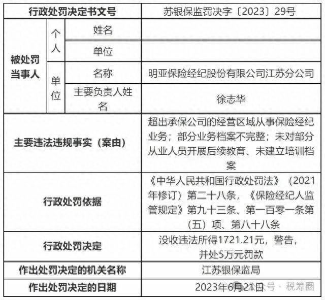 2023年6月份据江苏银保监局网站消息,该局对明亚保险经纪江苏分公司作出处罚,涉及超出承保公司经营区域从事保险经纪业务等多项违规。明亚保险经纪江苏分公司作出处罚,涉及超出承保公司经营区域从事保险经纪业务等多项违规。