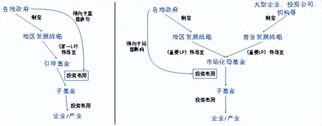 根据资本的不同来源,及其背负的不同的投资诉求,国内的母基金实体主要分为两大类别:引导基金和市场化母基金。抛去个别特例,二者的区别可用下图示意: