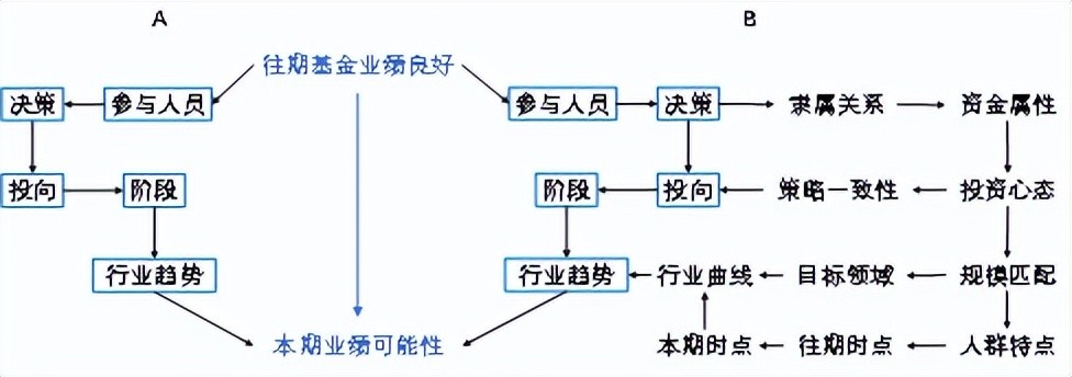 第二,母基金的门槛在门内,其深层次的业务逻辑非常复杂,而且也会随着基金布局的产业不断变化。以一个具体问题为例:如何看待直投团队的过往业绩与未来业绩?我们用下图,以两种比较极端的处理方式作示意,表面上看,AB两个机构的主要做法并没有差别,都是把过往业绩作为预估未来业绩的参考,但是在同样的表象之下,A和B的业务逻辑之间,却存在着巨大的差异。