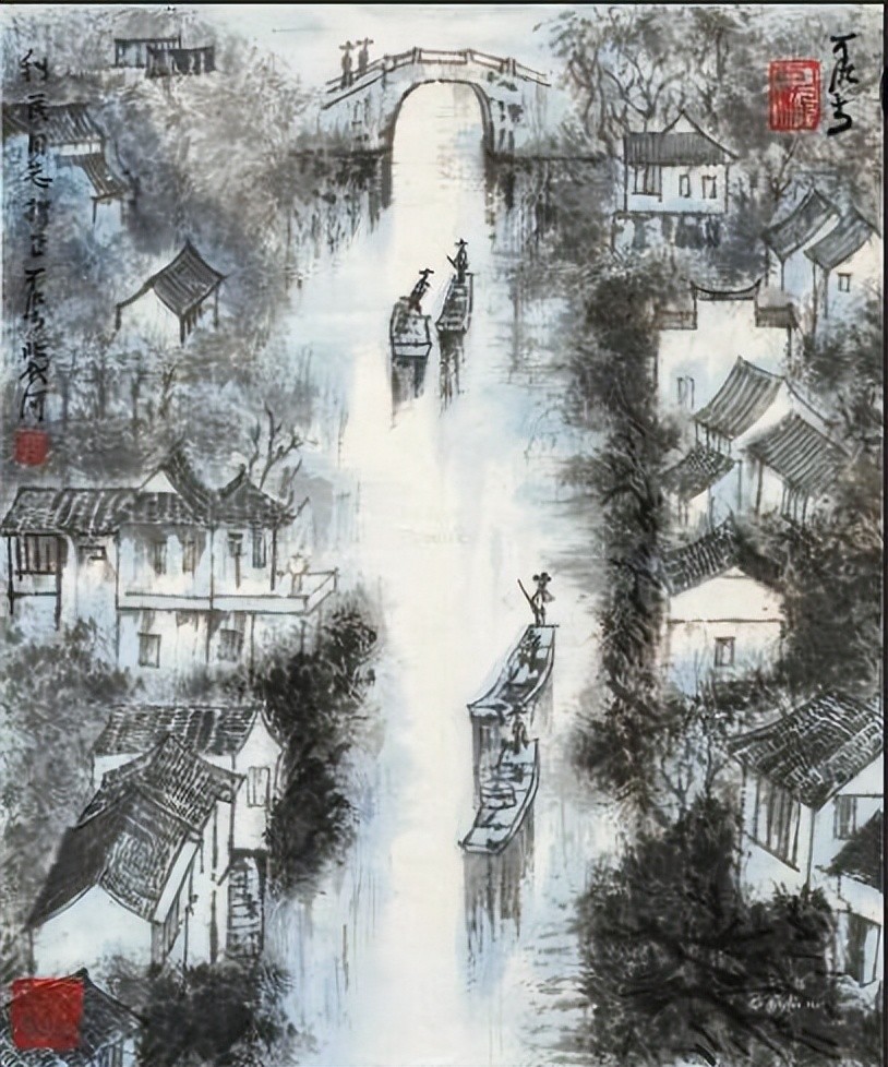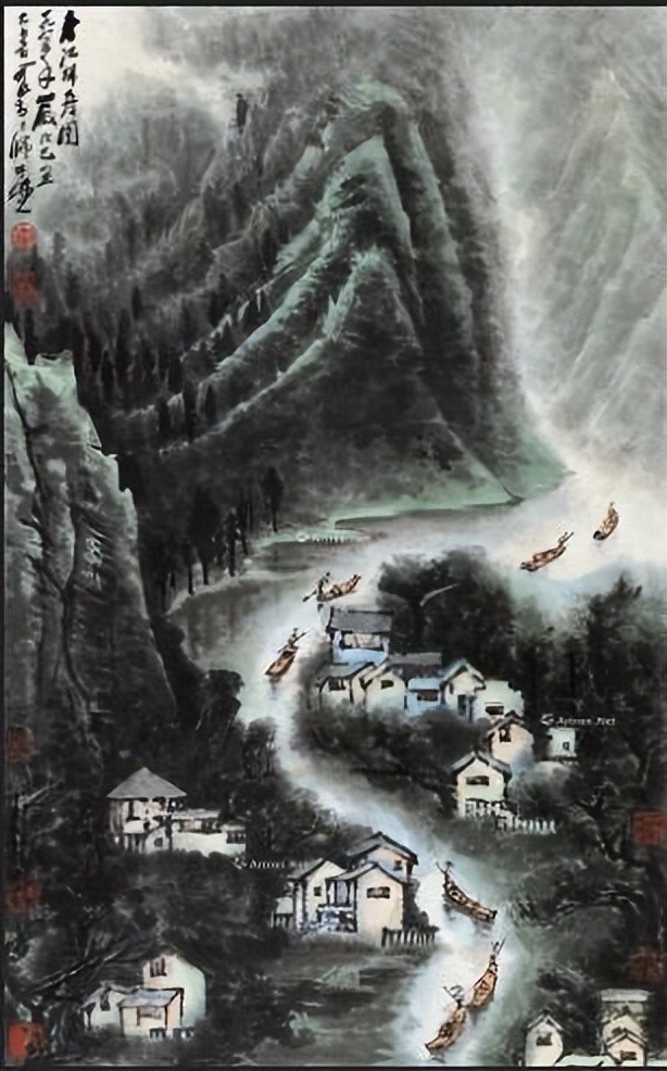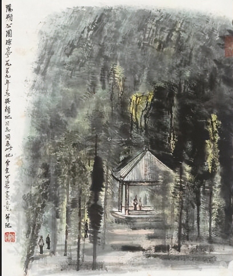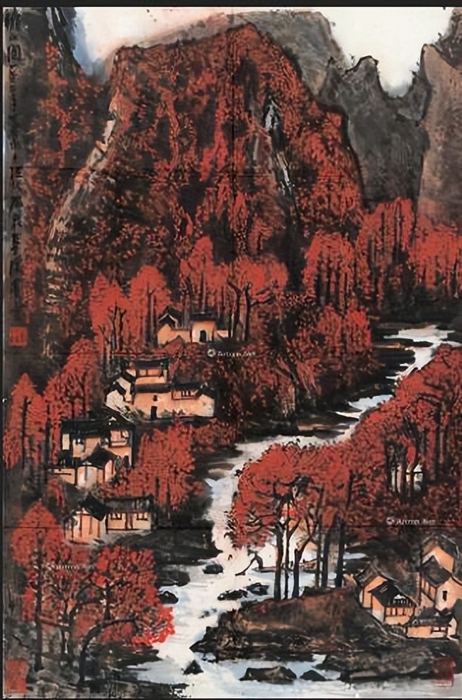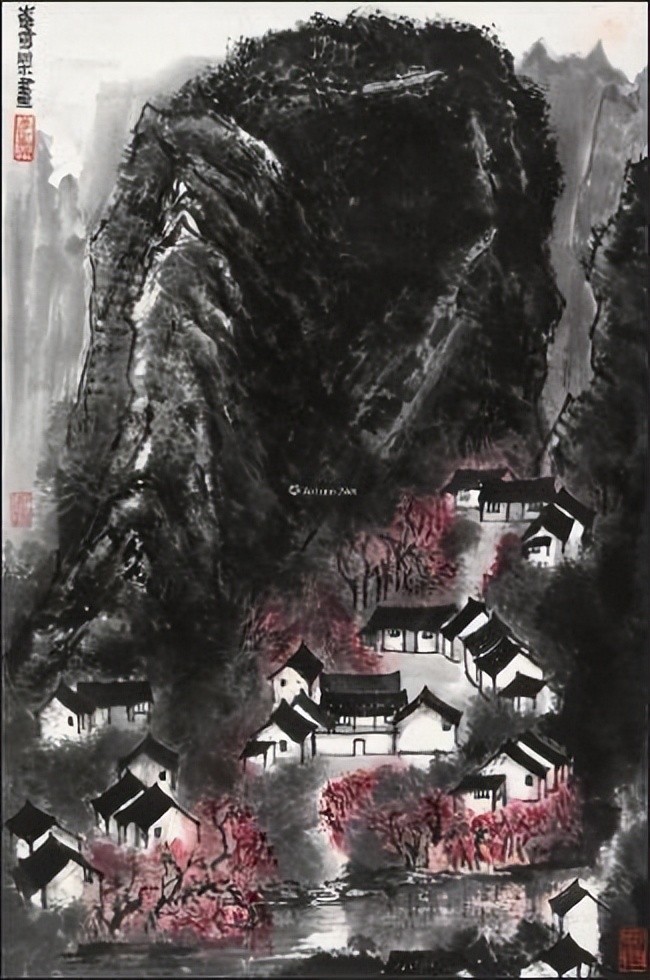 1954年后至文革后的1978年为第二阶段。这是他山水艺术的风格建立期,也就是他深入生活、营构自我语言的重要转折与成就期。此期作品,深入细腻,写实而又写意,重视“观物”,正为河山立了不少“传”,成为李家山的主体内容。如《桂林春雨》(1959)、《杏花春雨江南》(1961)、《鲁迅故乡绍兴》(1962)、《万山红遍》(1964)、《山顶梯田》(1974)等大量作品。