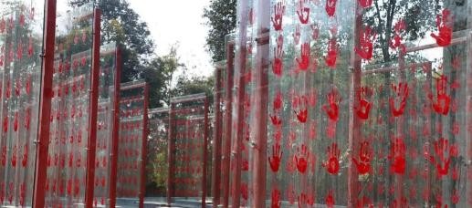 抗战老兵手印广场上,一排排的玻璃上面整整有4000多名老兵们的手印。