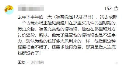 更有网友说:在去年下半年的一天(准确说是12月23日),我去成都一个古玩市场正碰见樊建川在那里买几件民国时期的历史文物,准备充实他的博物馆,他也在那里和对方讨价还价。所以,他为了经管他的博物馆也是不遗余力,别认为他的钱好像大风刮来的一样,他做到这种程度相当不错了,还要求他再免费,那真是做人连底线都没有了!