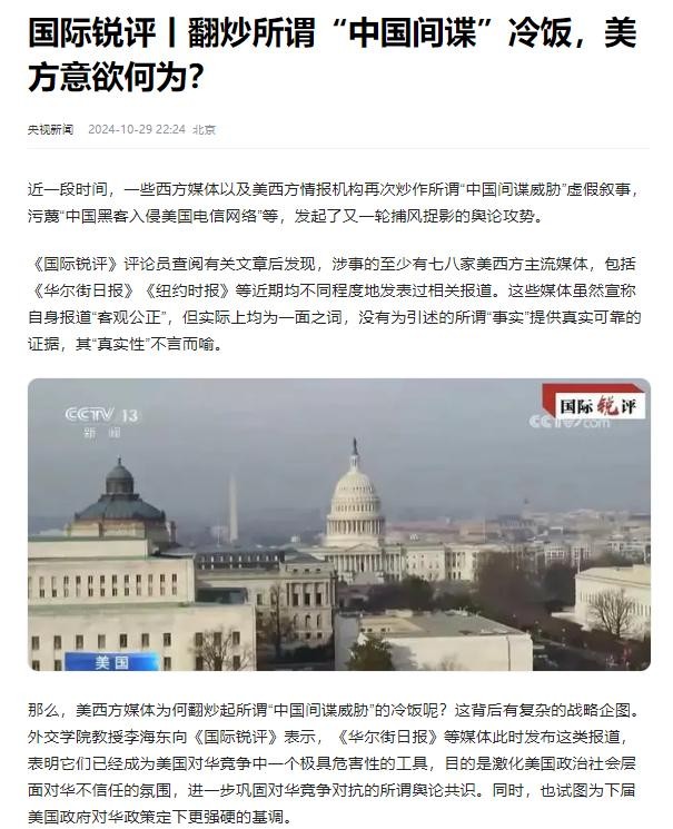 央视新闻在2024年10月29日《国际锐评丨翻炒所谓“中国间谍”冷饭,美方意欲何为?》的报道