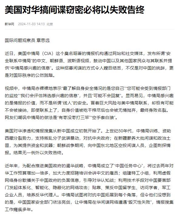 新华网在2024年11月3日《美国对华搞间谍窃密必将以失败告终》的报道